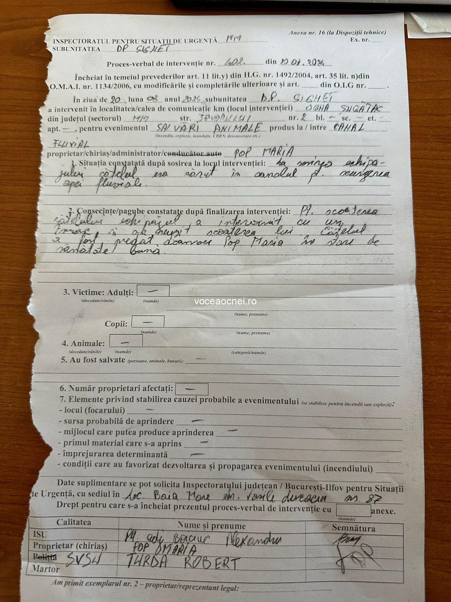Situația dramatică a luat o turnură pozitivă abia după ce o altă persoană, alarmată de plânsetele continue ale câinelui, a decis să sune la 112. O autospecială de pompieri de la Sighetu Marmației s-a deplasat imediat la fața locului și, în urma unei operațiuni de salvare, cățelușul a fost scos în siguranță din canal.